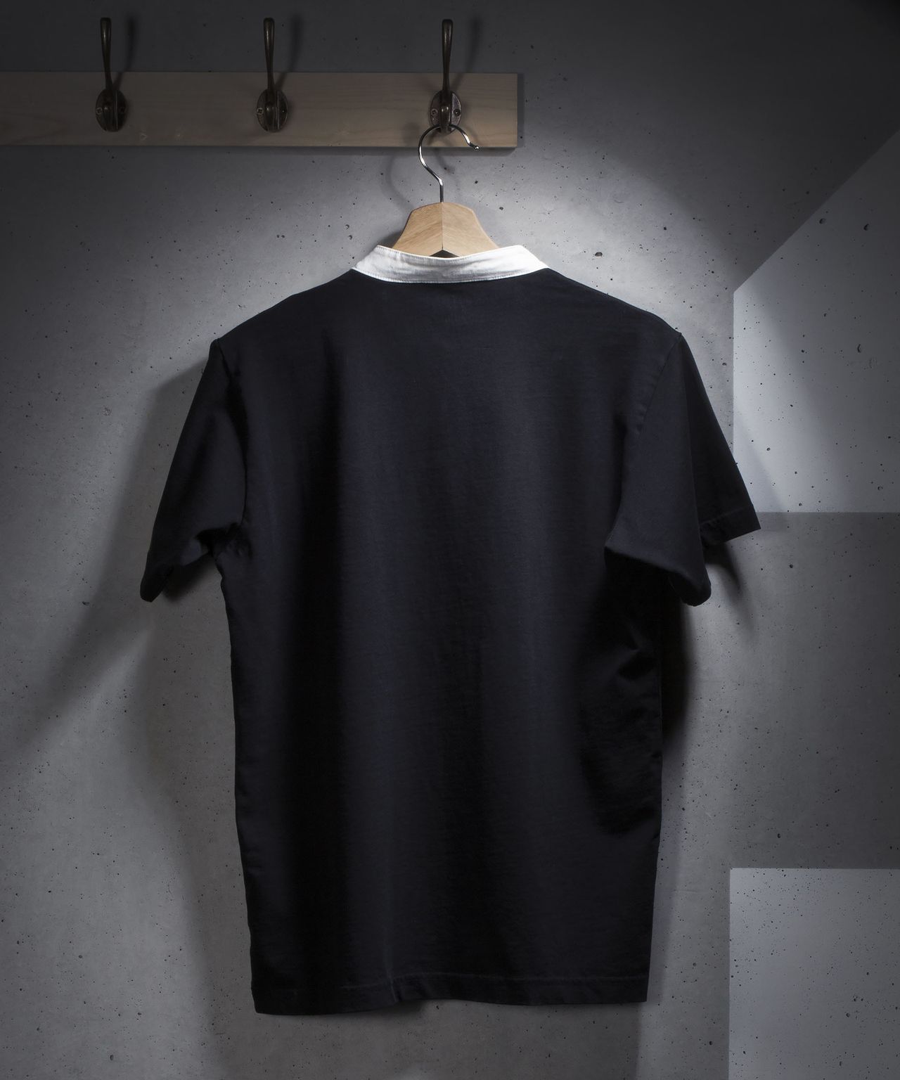 It's black with a white collar and large badge on the left chest.